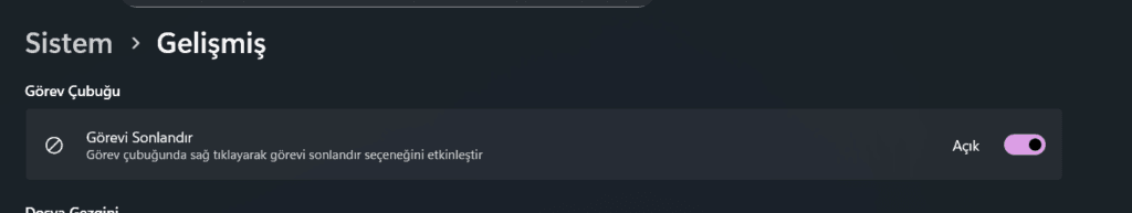 Görevi Sonlandır ayar kutucuğunu aktif ediyoruz. Artık herhangi bir uygulamaya, görev yöneticisine gitmeye gerek kalmadan görevi sonlandırabiliriz.